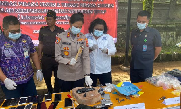 resjembrana,bali,go.id,Polda Bali, Polres Jembrana – Kejaksaan Negeri Jembrana memusnahkan sejumlah barang bukti dari 48 perkara tindak pidana umum dan khusus yang telah berkekuatan hukum tetap (inkracht), Selasa (24/6). Pemusnahan dilakukan di halaman Kantor Kejaksaan Negeri Negara dan dihadiri oleh unsur Forkopimda Kabupaten Jembrana.