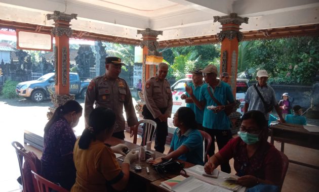 Pekutatan Jembrana, Kapolsek Pekutatan Kompol I Putu Suarmadi, S.H., M.H., beserta anggota melaksanakan pendampingan terhadap kegiatan pemeriksaan kesehatan kepada para Lansia di Balai Desa Adat Pengeragoan Dangin Tukad, Desa Pengeragoan, Kecamatan Pekutatan oleh petugas kesehatan UPTD Puskesmas II Pekutatan, pada hari Selasa, (19/08/2025).